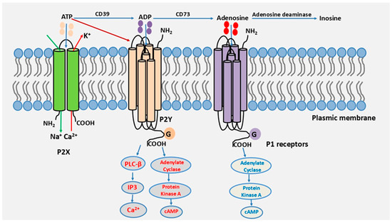 In a multicellular system, purinergic signaling enables individual cells to adjust their reactions, ultimately benefiting the organism as a whole [5]. Three fundamental components make up purinergic signaling: (i) mechanisms that generate and release ATP into the pericellular space; (ii) purinergic receptors that detect released ATP and its metabolites and trigger intracellular signals that control cell functions; (iii) mechanisms that stop purinergic signaling through cellular re-uptake, enzymatic breakdown of ATP, or simple diffusion of ATP and its metabolites away from cells [5].