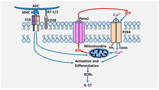 We also investigated the involvement of P2 receptors in the reactivation of Th17 cells, which refers to the capacity of polarized/differentiated Th17 cells to produce IL-17. To this end, receptor antagonists were not added during differentiation but only during the reactivation of polarized Th17 cells with anti-CD3/CD28 antibodies. Following this activation, we found that inhibition of the P2X4 receptor with 5-BDBD decreased IL-17 production but had no effect on IFN-γ production. On the other hand, inhibition of P2X7 and P2Y11 receptors did not affect the output of either cytokine. Furthermore, combined inhibition of P2X4, P2X7, and P2Y11 receptors did not produce a more potent inhibition on IL-17 production than inhibition of the P2X4 receptor alone. These results suggest that the P2X4 receptor is the most critical P2 receptor in IL-17 production. This is supported by the fact that the P2X4 receptor is involved in the expression of retinoic acid-receptor-related orphan receptor c (RORc) but not T-bet. These two transcription factors are the primary regulators of IL-17 and INF-γ gene expression, respectively [34]. These studies suggest that purinergic signaling differentially regulates helper T cell programs and identify for the first time the P2X4 receptor as a primary receptor in the activation and differentiation of human Th17 lymphocytes. However, it remains to be determined by which mechanisms the P2X4 receptor contributes to the differentiation of human Th17 cells. Interestingly, the P2X4 receptor also regulates human Th2 activation, suggesting it could also be important in Th2-dependent immunity [34]. A model by which the P2X4 receptor promotes Th17 cell differentiation and activation is depicted in Figure 2.