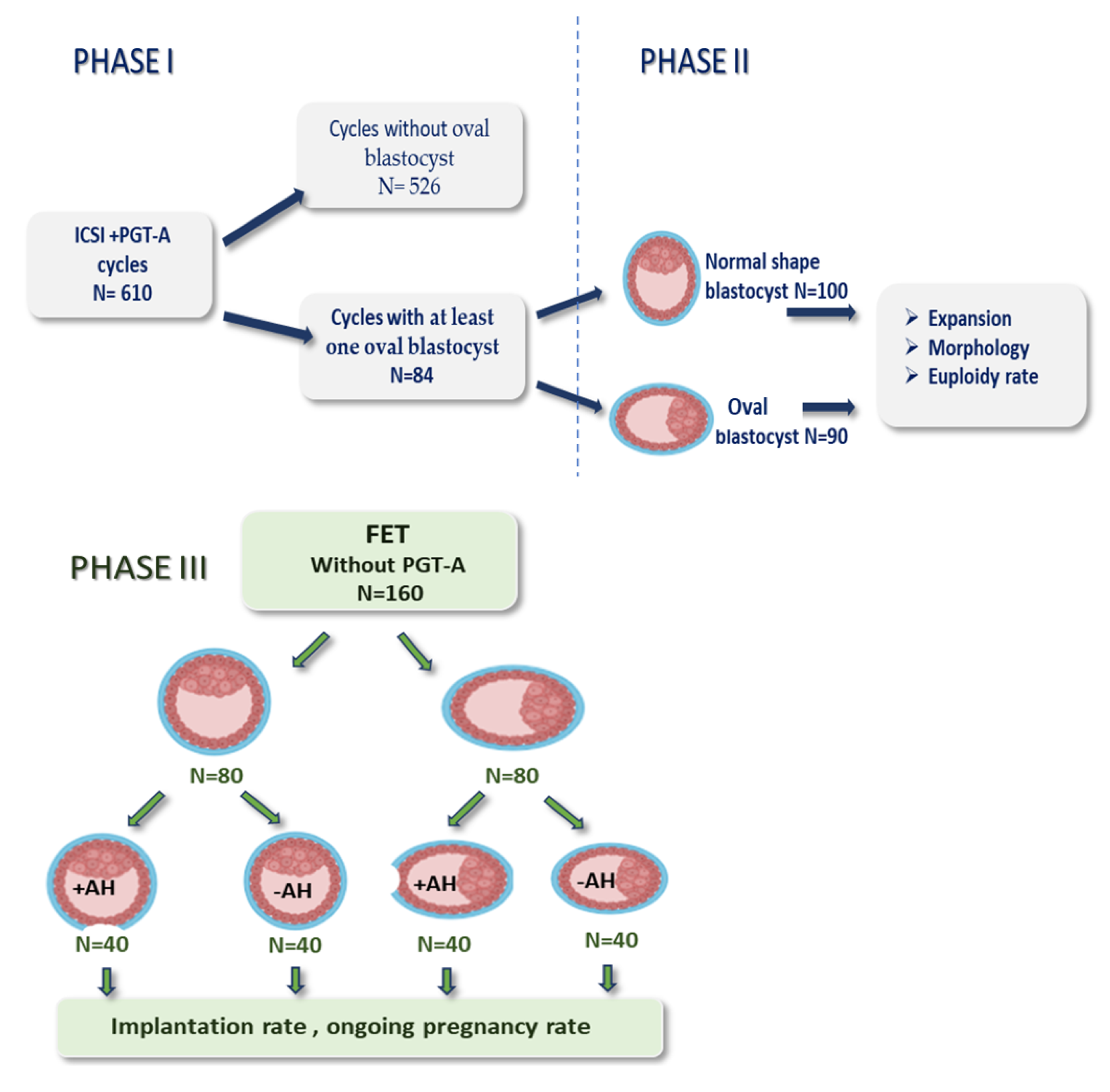 Implantation rate with AH, n (%) | 24/40 (61%) a | 25/40 (62%) a |