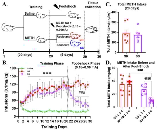 METH self-administration and contingent foot shocks result in compulsive METH taking in a subpopulation of rats. (A) Experimental timeline. (B) The figure shows a steady rise in METH infusions for the first 20 days in both SR and SS groups and a marked reduction in METH infusions in the SS rats during the 9-day foot shock phase. (C) The figure shows a non-significant difference in total METH intake over the first 20 days of the training phase. (D) The figure shows METH intake during the last 3 days of training without shocks (L 3 d) and the last 3 days of the foot shock phase (FS L 3 d). CT, saline; SR, shock-resistant; SS, shock-sensitive. Key to statistics: (1) *** p < 0.001, control compared with SR or SS; (2) ### p < 0.001, SR vs. SS comparisons; (3) @@ p < 0.01, comparison of drug intake during the last 3 days of METH SA vs. drug intake during the last 3 days of the foot shock phase.