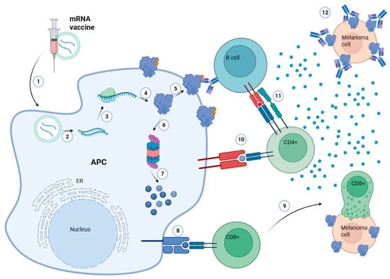 Mechanism of action of mRNA cancer vaccines and immune activation in melanoma. Following injection, lipid nanoparticle-formulated mRNA is taken up by antigen-presenting cells (APCs) (1,2), where it is released into the cytoplasm and translated into tumor-associated antigens or neoantigens (3). These antigens undergo proteasomal degradation (4–6) and are presented on major histocompatibility complex (MHC) class I and II molecules (7,8), leading to the activation of CD8+ cytotoxic T lymphocytes and CD4+ helper T cells (9,10). CD4+ cells further support B cell activation (11), resulting in the secretion of tumor-specific antibodies (12). This integrated cellular and humoral response targets melanoma cells expressing the encoded antigens, contributing to effective tumor eradication.