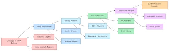 Conceptual flowchart outlining the major challenges and requirements in the delivery of mRNA vaccines, and their downstream immunological consequences. Starting from intrinsic delivery barriers—including mRNA instability, limited cellular uptake, and unintended activation of innate immune sensors—the design of efficient mRNA therapeutics must address key requirements for stability, targeted delivery, and endosomal escape. These challenges are met through diverse delivery platforms such as LNPs, polymeric carriers, and emerging biomimetic or intratumoral approaches. Effective delivery leads to antigen-presenting cell (APC) activation and efficient T cell priming, both of which are essential for eliciting robust adaptive immune responses. When integrated with combination therapies such as checkpoint inhibitors or innate immune agonists, these strategies culminate in durable antitumor immunity [38].