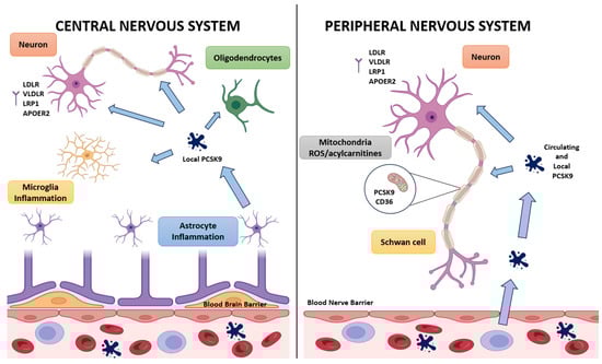 In the CNS, PCSK9 is produced locally by neurons, astrocytes, oligodendrocytes, and microglia, while circulating PCSK9 has negligible entry due to the restrictive blood–brain barrier. Local PCSK9 modulates members of the LDL receptor family (LDLR, VLDLR, LRP1, ApoER2), thereby influencing lipid uptake, receptor routing, neuronal differentiation, and synaptic plasticity. It can also lower pro-survival receptor abundance and promote apoptotic pathways in neurons, while astrocytic and microglial PCSK9 may couple lipid metabolism to neuroinflammation and barrier function. In the PNS, both circulating and locally expressed PCSK9 act on neurons and Schwann cells, as access is less restricted across the blood–nerve barrier. Here, PCSK9 regulates CD36 abundance at the Schwann-cell surface, shaping the balance of long-chain fatty-acid influx. In PCSK9 deficiency, elevated CD36 drives lipid overload, expansion of lipid droplets, acylcarnitine accumulation, and mitochondrial cristae disruption, which together contribute to small-fiber hypomyelination, C-fiber swelling in Remak bundles, and sensory conduction deficits. This defines a PCSK9–CD36–mitochondria axis that links systemic lipid handling with local metabolic vulnerability in peripheral nerves.