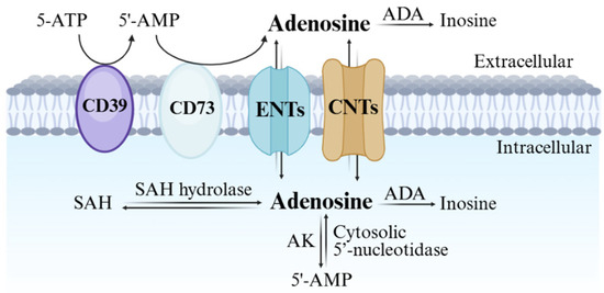 Adenosine biosynthesis, metabolism, and transport are summarized in Figure 1. The nucleoside can be synthesized both in the intracellular and extracellular space. The major extracellular biosynthetic mechanism involves the degradation of ATP, ADP, and AMP, due to the activation of the ecto-nucleoside triphosphate diphosphohydrolase 1 (CD39) and the ecto-5’-nucleotidase (CD73) [2]. Nevertheless, under physiological conditions adenosine is primarily generated intracellularly through the hydrolysis of S-adenosylhomocysteine (SAH) by SAH hydrolase [3], and of AMP by endo-5’-nucleotidase [4].