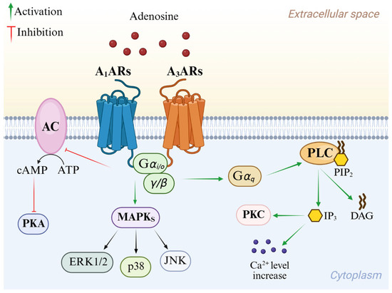Adenosine mediates its physiological effects by interacting with G protein-coupled receptors (GPCRs), classified into four subtypes: A1, A2A AR, A2B AR, and A3 AR adenosine receptors (ARs). All four ARs have been cloned and pharmacologically characterized [1]. All ARs modulate adenylyl cyclase (AC), thereby affecting cyclic AMP (cAMP) levels, but other effector systems have been observed [7]. Signal transduction pathways of A1 and A3 ARs are summarized in Figure 2. These AR subtypes are activated by nanomolar concentrations of adenosine [1] and preferentially couple to Gi and G0 proteins, thus decreasing AC activity and intracellular cAMP production. Additionally, they induce phospholipase C (PLC)-β activation, leading to an increase in inositol 1,4,5-trisphosphate (IP3), diacylglycerol (DAG), and intracellular Ca2+ levels, and activation of phosphokinase C (PKC) [1]. Activation of A1 and A3 ARs induces the intracellular phosphorylative cascade of the mitogen-activated protein kinase (MAPK) family, including MAPK p38, extracellular signal-regulated kinase 1/2 (ERK1/2), and Jun NH2-terminal kinase (JNK) [8,9,10]. A3 AR activation is also correlated to a different pathway from GPCR signaling which involves Ras homolog family member A (RhoA) and phospholipase D [11].