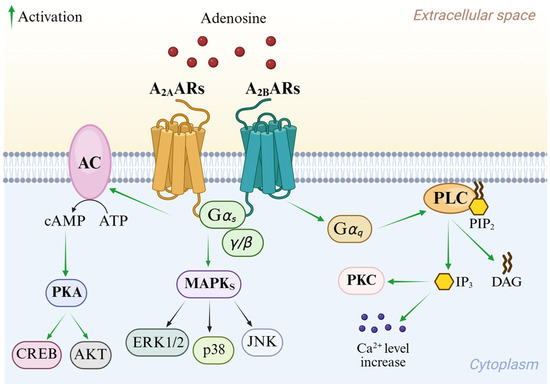 Signal transduction pathways of the A2A AR and A2B AR are reported in Figure 3. Although they share almost identical binding sites, A2A AR is activated by nanomolar concentrations of adenosine, while A2B AR requires micromolar levels [12]. Both subtypes couple to Gs proteins, thereby activating AC and consequently leading to the enrolment of different cAMP-dependent effectors including protein kinase A (PKA). Through the activation of PKA and cross-talk with protein kinase B (AKT), these pathways modulate cell growth and proliferation via the element-binding protein (CREB) [1]. Moreover, A2A and A2B ARs are involved in the activation of MAPK signaling [4,13,14]. In addition, A2B AR enrolment stimulates PLC through the Gq protein and regulates ion channels through its βγ subunits [4,14].