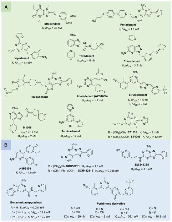(A) Structures of A2A AR antagonists and dual A2A/A2B AR antagonists undergoing clinical trials. (B) Structures of A2A AR antagonists used as pharmacological tools or showing promising activity in preclinical models of neurodegenerative diseases and cancer.