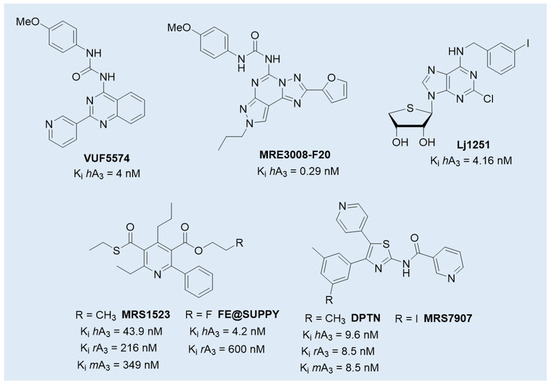 Structures of selected A3 AR antagonists with preclinical efficacy or cross-species activity.