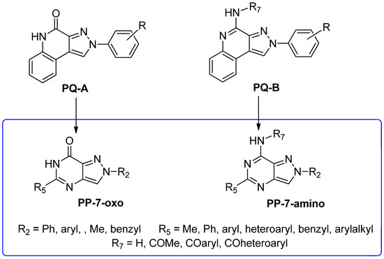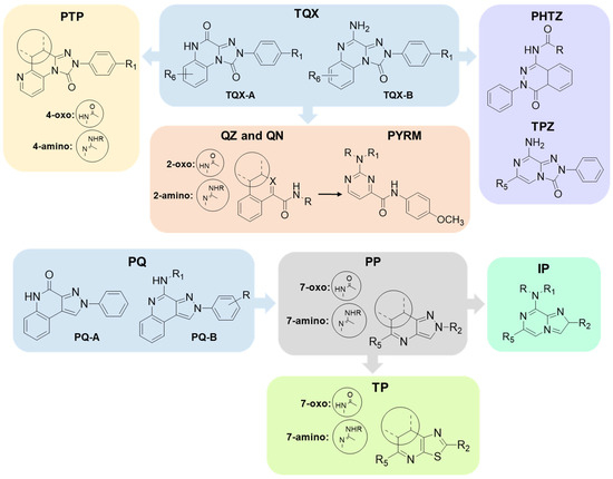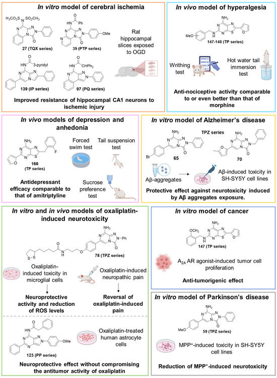 Specifically, this review focuses on different heterocyclic classes of AR antagonists that were designed starting from two tricyclic series, the 1,2,4-triazolo[4,3-a]quinoxalin-1-ones (TQX) and the pyrazolo[3,4-c]quinolines (PQ). Both the series were deeply investigated and from each of them simplified analogues were designed leading to bicyclic and monocyclic ligands (Figure 6). For each class of ligands, structure–activity relationships (SARs) are discussed, highlighting the structural features required for affinity and selectivity toward the different AR subtypes. The results of molecular docking investigation are reported to describe the hypothetical binding pose of the ligands at the AR recognition sites. Additionally, the results of in vitro and in vivo pharmacological studies are presented, emphasizing the neuroprotective, antinociceptive, antiproliferative, and antidepressive effects of AR antagonists.