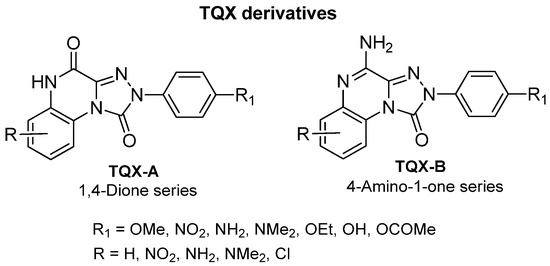 This section presents the study of 2-aryl-1,2,4-triazolo[4,3-a]quinoxalin-1-one derivatives, classified into the 1,4-dione and the 4-amino-1-one series (TQX-A and TQX-B, respectively, Figure 7). Notably, the triazoloquinoxalin-1,4-dione scaffold (TQX-A) emerged as a valuable framework for the development of potent and selective A3 AR antagonists. In contrast, the 4-amino-triazoloquinoxalin-1-one core (TQX-B) gave rise to potent and selective antagonists of A1, A2A, or A3 AR subtypes, depending on the substitution pattern on the aromatic rings and the 4-amino group [141,142]. Finding new potent antagonists for A3 AR within the TQX-A series was of high interest, as the involvement of this AR subtype in regulating several pathological processes, including neuronal inflammation, immune responses, and cardiac function, was becoming increasingly evident. Therefore, selective A3 AR antagonists were sought both as pharmacological probes to elucidate receptor-mediated pathophysiological mechanisms and as candidates for therapeutic intervention in autoimmune diseases, cancer, brain injury, and neurodegenerative disorders [13,56,74,143,144].