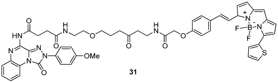 The robustness and versatility of the 4-amino-triazoloquinoxalinon-1-one scaffold to develop hA3 AR antagonists were recognized by Vernall et al. [155] who selected derivative 6 (Table 2) as the lead for the development of fluorescent antagonists to be used as molecular probes for the study of the A3 AR. Various fluorophores were introduced at the 8-amino position of 6 through linkers of different natures. The most promising compound was the BODIPY-X-630/650-conjugated derivative 31 (Figure 8) exhibiting high affinity for the hA3 AR (pKD = 9.36 ± 0.16) and over 650-fold selectivity versus other ARs. The compound possessed excellent imaging properties, making it a valuable tool for investigating A3 AR.