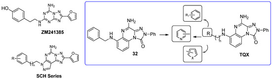 Some investigations on the TQX-B series focused on the development of hA2A AR antagonists, which were designed taking the well-known A2A AR antagonists ZM241385 [156] and derivatives belonging to SCH series as lead compounds (Figure 9) [157,158]. The 4-amino-6-benzylamino-2-phenyl-substituted TQX derivative 32 was the first to be synthesized (Figure 9), resulting in a potent and selective hA2A AR antagonist [141,142]. Polar substituents capable of forming hydrogen bonds (F, OCH3, OH, COOH) were introduced on the 6-benzylamino moiety since they might enhance both hA2A AR affinity and the physicochemical properties of the compounds, such as water solubility [142]. The carboxy group afforded the best hA2A AR affinity (Table 5, derivative 33). Even if some of the new compounds exhibited nanomolar hA2A AR affinity, none of them exceeded the hA2A AR affinity and selectivity of the parent compound 32. The replacement of the phenyl moiety of 32 with less hindered bioisostere furyl or thienyl rings gave the best binding affinity results (compounds 34, 35).