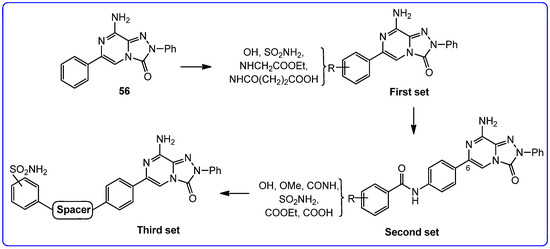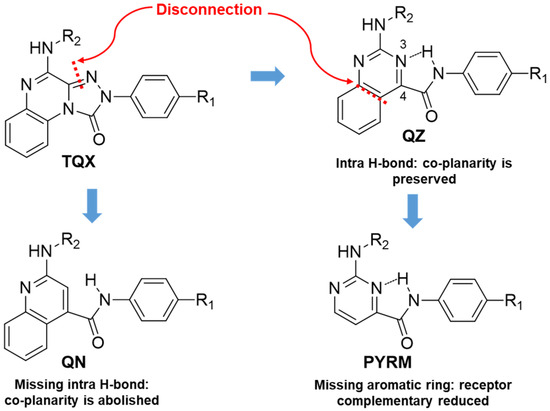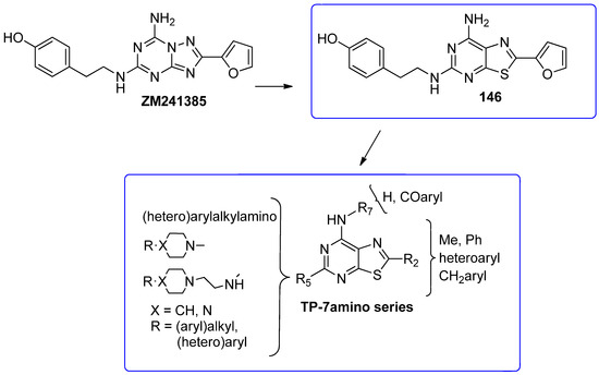 An in silico molecular simplification approach was employed to design three series of TQX analogues as new hA3 AR antagonists [160] (Figure 10).