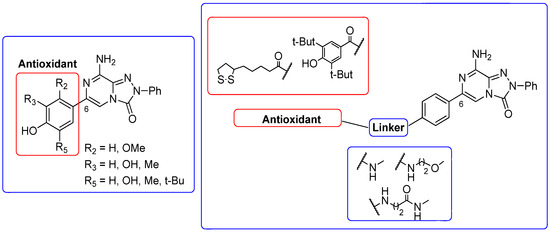 - Falsini, M.; Catarzi, D.; Varano, F.; Ceni, C.; Dal Ben, D.; Marucci, G.; Buccioni, M.; Volpini, R.; Di Cesare Mannelli, L.; Lucarini, E.; et al. Antioxidant-Conjugated 1,2,4-Triazolo[4,3-a]pyrazin-3-one Derivatives: Highly Potent and Selective Human A2A Adenosine Receptor Antagonists Possessing Protective Efficacy in Neuropathic Pain. J. Med. Chem. 2019, 62, 8511–8531. [Google Scholar] [CrossRef]