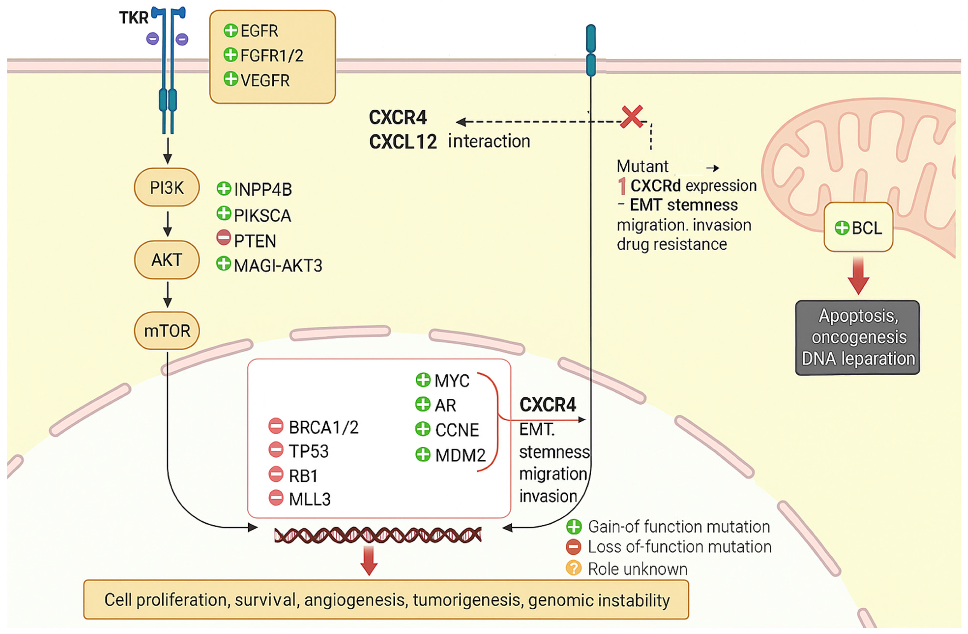 1 | Epithelial–Mesenchymal Transition (EMT) | CXCR4 signalling upregulates EMT transcription factors, increasing cell plasticity and invasiveness. | Snail, Slug, Twist, ZEB1 | Enhances migratory capacity, reduces drug sensitivity. | [61] |