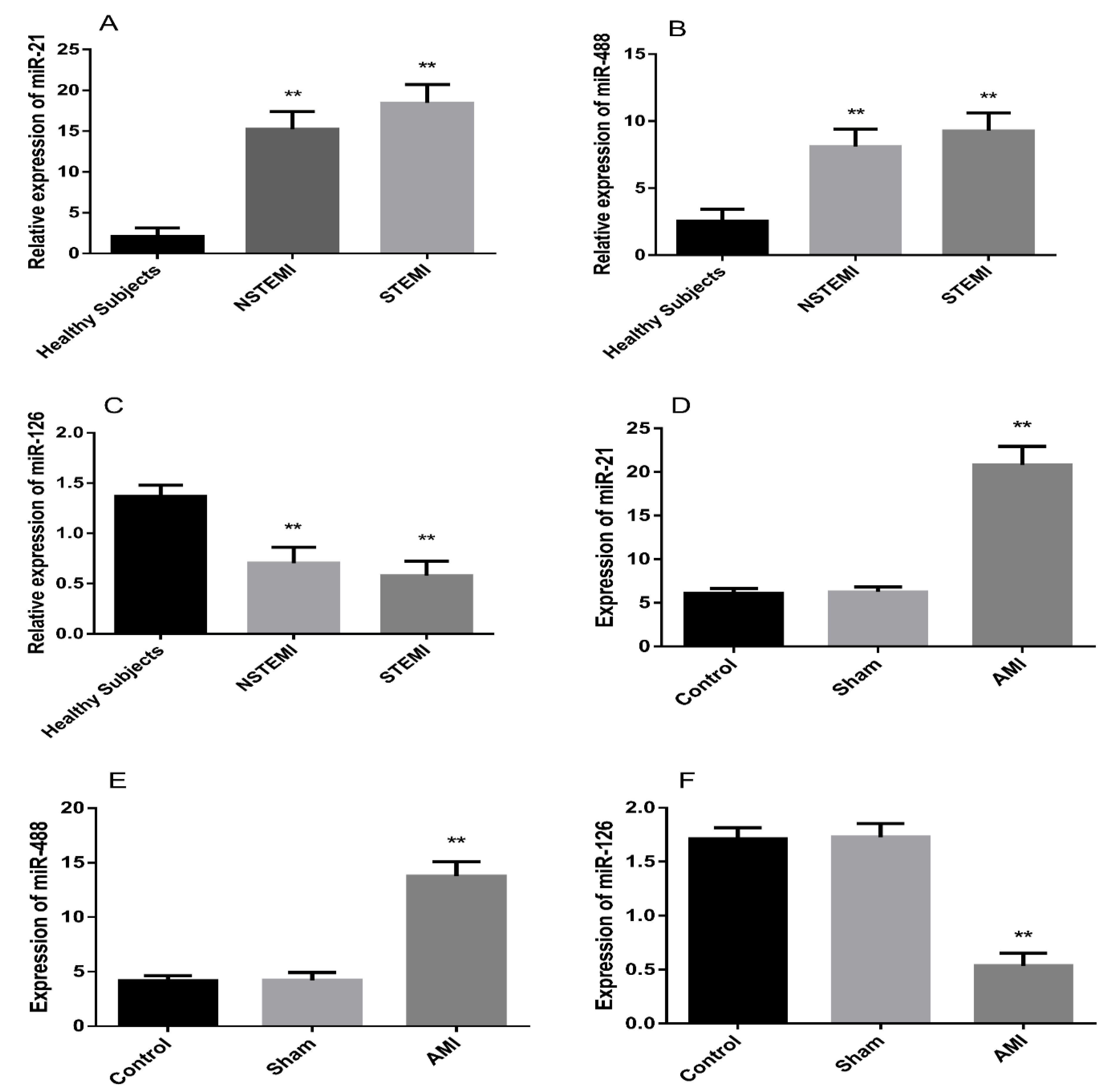 3.2. Expression of Plasma miRNAs (miR-21, miR-488, miR-126) in Acute Myocardial Infarction Patients and Mice AMI