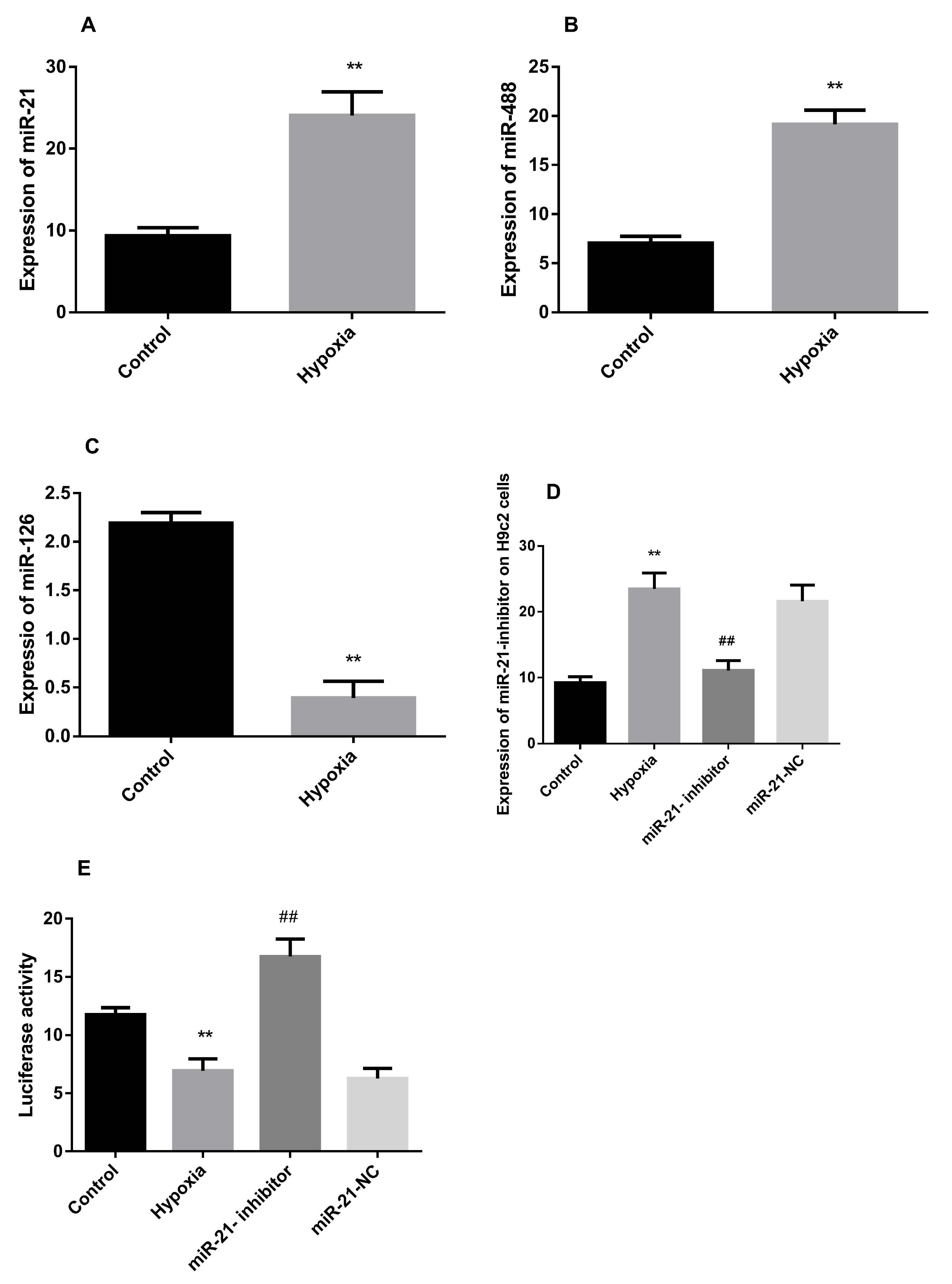 3.4. Expression and Luciferase Reporter Assay of miR-21, miR-488, and miR-126 in H9c2 Cells