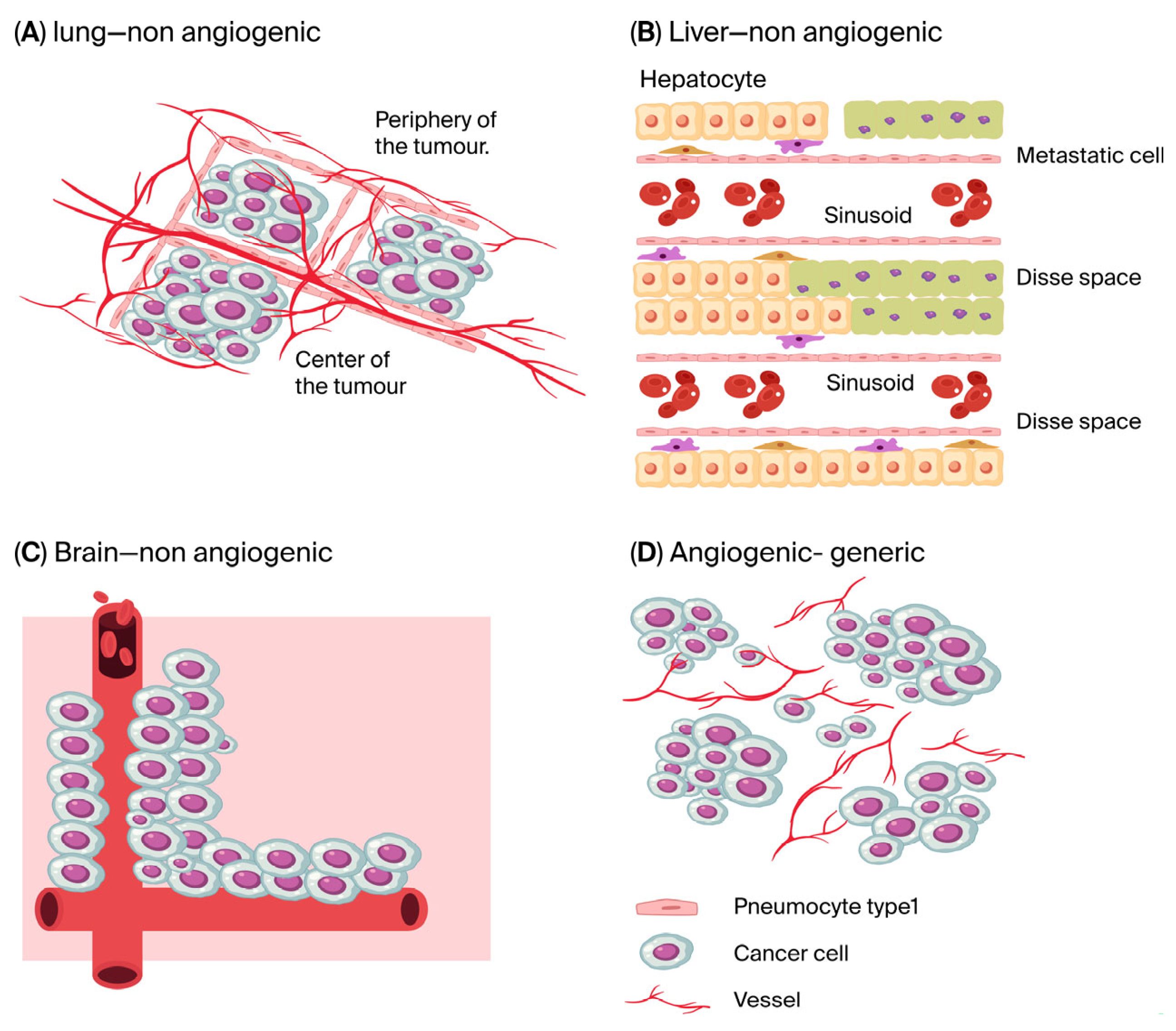 13] further studied lung metastases using a mouse model, injecting RENCA (RENal CAncer) cells into the tail veins of mice with or without Sunitinib on days 10, 21, and 36. By day 21—after 10 days of Sunitinib—70% of metastases were non-angiogenic, while only 30% were angiogenic (compared to 70% angiogenic and 30% non-angiogenic in controls). Long-term treatment (36 days) with Sunitinib resulted in a predominance (75%) of non-angiogenic metastases. Although untreated mice had to be euthanized earlier due to tumour burden, treatment with anti-angiogenic agents slightly improved overall survival but not tumour-free survival, as the non-angiogenic tumour burden rapidly increased (comprising 75% of growing metastases). Tumour endothelium single-cell sequencing revealed that co-opted endothelial cells lacked proliferation and tip cell markers. Similarly, pericytes were quiescent. The authors found it surprising that neither endothelial cells nor pericytes showed activation—whether in spontaneous non-angiogenic tumours or after Sunitinib treatment—as neoplastic cells typically induce such activation both in vitro and in vivo. Our interpretation is that activation likely depends on angiogenic factors: when angiogenesis is blocked pharmacologically or absent due to co-option, the endothelium resembles that of normal lung tissue. The authors suggested, plausibly, that the co-opted endothelium may induce pericyte quiescence and resistance to activation. Finally, they examined immune cells and their interaction with the vascular microenvironment. In Sunitinib-treated mice, macrophages displayed an enhanced matrix-remodelling phenotype, which may in turn facilitate vascular co-option by metastases.