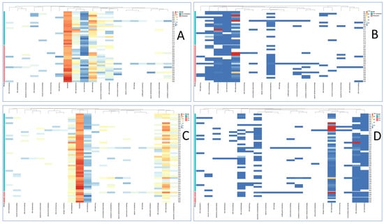 Heatmap of taxon abundance stratified by the presence of distant metastases (A,B) and by tumor grade (C,D). Data are shown as absolute values (decimal logarithm, log10, of taxon genome equivalents per PCR reaction; panels (A,C)) and as percentages relative to the total bacterial load (panels (B,D)). White indicates absence of the taxon (bacterial DNA not detected). By visual inspection, hierarchical clustering reveals a subset of metastatic cases with higher absolute Fusobacterium nucleatum signals (A), whereas after normalization the relative contribution of Acinetobacter increases predominantly in non-metastatic samples (B). Many taxa exhibit zero-inflated, sparse patterns (white blocks). Grade-stratified panels (C,D) show less coherent structure with only modest shifts in several commensals (e.g., Eubacterium rectale). These patterns are descriptive; formal statistics are reported in the Results.