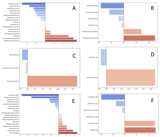 LASSO-derived taxon coefficients. Coefficients for the investigated taxa that discriminate patients across clinicopathological groups. A positive coefficient indicates a taxon positively associated with (i.e., “pro” for) the target group; a negative coefficient indicates a taxon inversely associated with (i.e., “contra” to) the target group. Both absolute abundance (log10 genome equivalents per PCR reaction) and relative abundance (percentage of the total bacterial load) were analyzed. Panels: (A,B) metastatic CRC group (absolute and relative abundance, respectively); (C,D) higher-grade CRC group (G2 and above; absolute and relative, respectively); (E,F) CRC with detected KRAS, NRAS, or BRAF mutations (absolute and relative, respectively).