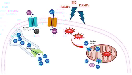 Schematic representation of cardiac oxidative stress and calcium overload during myocardial ischemia/reperfusion injury (MIRI). Reperfusion injury (IR), pathogen-associated molecular patterns (PAMPs), and damage-associated molecular patterns (DAMPs) cause increase in intracellular reactive oxygen species (ROS) and reactive nitrogen species (RNS). Oxidative stress causes release of calcium ion (Ca2+) form mitochondria and sarcolemma through Sarco-Endoplasmic Reticulum Calcium ATPase (SERCA Ca2+-ATPase).