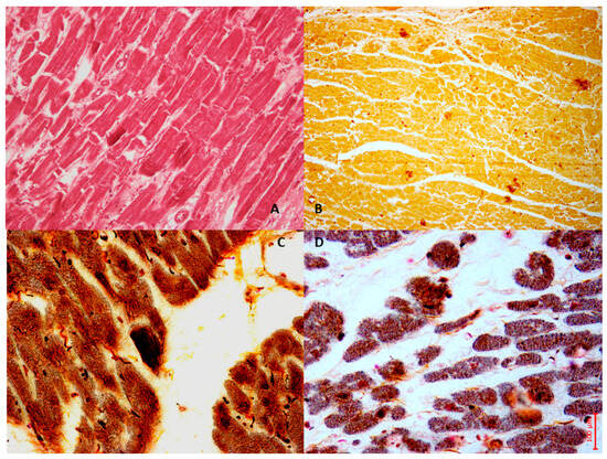 AMI is a major global health issue and still represents the single most prevalent cause of death worldwide, despite continuous advances in AMI prevention and treatment [1]. Myocardial infarction (MI) is also a widespread occurrence in forensic medicine, with concerns related to both the differential diagnosis with other cardiovascular conditions and the correct dating of the disease [2,3]. AMI is defined as cardiomyocyte necrosis in a clinical setting consistent with acute myocardial ischemia, as identifiable through a series of clinical (prolonged chest pain), biochemical (elevated cardiac troponin levels), and instrumental (ECG and/or regional wall motion abnormalities) parameters [4]. Ischemia is mainly caused by acute coronary atherothrombotic occlusion or mural thrombus (MI type 1), but it could also be due to other mechanisms reducing coronary flow and/or oxygen supply (MI type 2–5), as recently updated in the fourth universal definition of myocardial infarction, published in 2018 by the Joint Task Force of the European Society of Cardiology, the American College of Cardiology Foundation, the American Heart Association, and the World Heart Federation [5]. This condition of tissue hypoxia triggers specific metabolic (arrest of aerobic metabolism and onset of anaerobic glycolysis with progressive accumulation of catabolites), inflammatory, and oxidant changes, leading to evolving cardiac cell damage—from reversible injury to irreversible death—followed by cardiac repair [6].