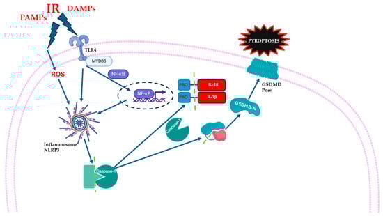 The expression of the NLRP3 inflammasome can be regulated through Nuclear Factor (NF)-kβ, which is activated by Toll-like receptor 4 (TLR4) once it recognizes tissue damage or a signal of infection (DAMPs or PAMPs). After its activation, NF- kβ in turn also promotes the expression of pro-IL-1β and pro-IL-18, which are then activated by caspase-1, a product of NLRP3 action on pro-caspase-1. IL-1β and IL-18 enhance the inflammatory response by increasing cytokines’ production, immune response, and extracellular matrix’s turnover [37]. Consistently, in an in vitro model of MIRI, Huang et al. demonstrated the overexpression of the NLRP3 inflammasome by cardiac fibroblasts, with a consequent increase in cellular levels of IL-1β, IL-18, TNF-α, NLRP3, caspase-1, and ASC after hypoxia/reoxygenation (H/R) [38].