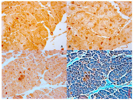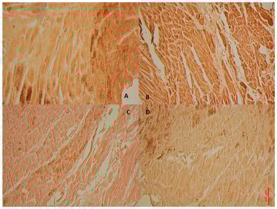The case of a 59-year-old woman who died due to AMI (A). Intermediate positive reaction of BCL-2 antibody in ventricular myocytes (brown reaction). (B) BAX labeled myocardial cells with intensive positive (in brown) (C,D). Intense positive immunohistochemical reaction with antibody anti-Beclin-1 (C), and anti-ATF6 (D).