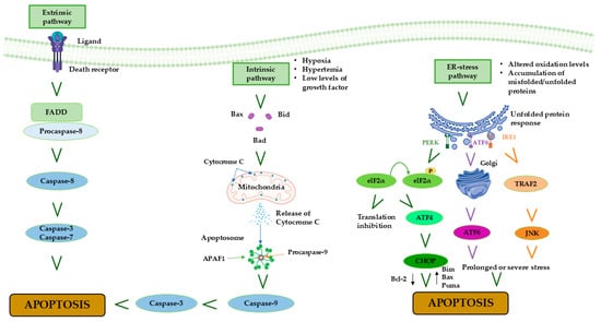 The term “apoptosis” indicates a highly organized, evolutionary conserved, genetically regulated pathway for maintaining homeostasis in multicellular organisms and was coined by Kerr, Wyllie, and Currie in 1972 [51]. This process refers to a controlled form of cellular death, wherein the cell undergoes distinct structural modifications like contraction and condensation of cytoplasm and nucleus, with the formation of apoptotic bodies [51]. Caspases, a family of cysteine proteases, are responsible for the breakdown and fragmentation of cytoskeletal and nuclear proteins during the progression of apoptosis [52]. Subsequently, macrophages phagocytize apoptotic bodies, which are recognized due to the presence of externalized phosphatidylserine on the outer leaflet of the bilayer envelope, without triggering any inflammation [53]. Previous studies have highlighted that apoptotic cell death is one of the primary forms of cardiomyocyte death during myocardial infarction and MIRI [54,55]. As widely addressed, MIRI induces an elevation in ROS levels, cellular damage, and cardiovascular dysfunction, ultimately resulting in cardiomyocyte apoptosis [56,57]. The induction of apoptosis occurs via three major signaling pathways: the extrinsic pathway, the intrinsic pathway, and the endoplasmic reticulum stress (ERS) pathway [58]. The extrinsic pathway is triggered by the presence of transmembrane death receptors, which are classified as members of the tumor necrosis factor receptor (TNFR) family and possess the “death domain”. The transmission of death signals from the cell surface to intracellular pathways is facilitated by the coupling of specific ligands and their corresponding death receptors. Among the various ligand–receptor pairings, the most relevant include the apoptosis-stimulating fragment ligand (FasL) and FasR, TNFα, and TNFR1, as well as TNF-related apoptosis-inducing ligand (TRAIL) and either DR4 or DR5 [58]. Binding of ligands with death receptors results in the recruitment of Fas-associated death domain (FADD) and its subsequent binding to the ligand–receptor complex [59]. FADD activates the pro-caspase-8, leading to the formation of a death-inducing signaling complex (DISC) [60]. This complex then activates caspase-8, which subsequently activates caspase-3 and -7. This process triggers the apoptotic cascade response, ultimately resulting in the execution phase of apoptosis [61,62]. It has been shown that caspase-3 overexpression leads to a higher susceptibility to enhanced myocardial injury following coronary artery ligation, wherein the ischemic tissue is reperfused for a duration of 24 h, resulting in an increase in mortality following MIRI [63]. Additionally, the Fas pathway plays a crucial role in mediating cardiomyocyte apoptosis during MIRI [64], and the onset of reperfusion in mouse models of MIRI is accompanied by an increase in TNF-α and TRAIL levels [65].