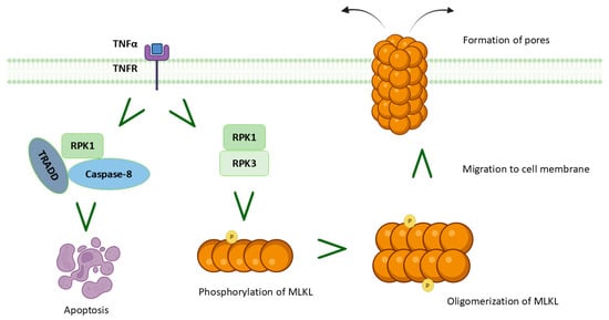 Schematic representation of necroptosis during myocardial ischemia/reperfusion injury (MIRI). Necroptotic pathway in myocardial infarction, illustrating mixed-lineage kinase domain like protein (MLKL) phosphorylation, oligomerization, translocation to the plasma membrane, pore formation, and progression to apoptosis.