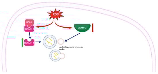 Schematic representation of autophagy’s activation during myocardial ischemia/reperfusion injury (MIRI). Increased reactive oxygen species (ROS) levels can disrupt the BCL2–Beclin-1 complex, freeing Beclin-1 to promote the formation of autophagosomes. ROS also cause a decrease in lysosome-associated membrane protein 2 (LAMP2) expression. Reduction in LAMP2 limits lysosomal degradation capacity, leading to defective autophagic flux and contributing to cellular damage under oxidative stress.