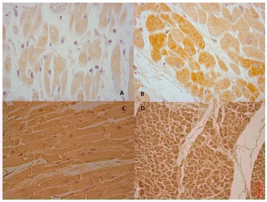 The case of a 78-year-old man who died after a post-surgery STEMI treated with PPCI. (A,B). Strong immunolocalization of calpain-1 in ventricular myocytes (brown reaction). (C) Intense positive immunohistochemical reaction with antibody anti-calpain-1 in bright field, and the same field with phase contrast (D).