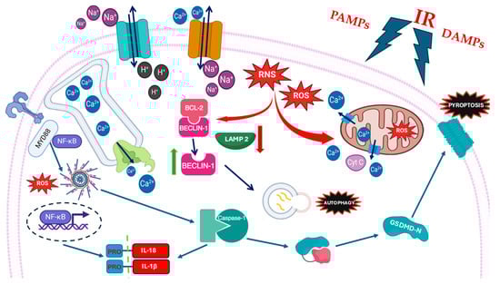 One of the mechanisms that sustains autophagy during MIRI is related to the impaired autophagic efflux that develops due to the interaction of other molecules involved in MIRI with the classical mechanisms that regulate the process under physiological conditions [102]. ROS, whose accumulation during reperfusion has been previously covered, can interact with the expression of LAMP 2 and BECN-1. LAMP 2 is required for phagosome–lysosome fusion, while BECN-1 is able to interfere with this process (Figure 7). The accumulation of ROS causes lower expression of LAMP 2 and overexpression of BECN-1; this causes accumulation of autophagosomes and consequently of damaged cellular components. An impaired autophagy flux was confirmed in other studies which suggested that MIRI may lead to the accumulation of autophagosomes [103]. This accumulation, in turn, enhances inflammation and supports the production of ROS and increased mitochondrial damage [104].
