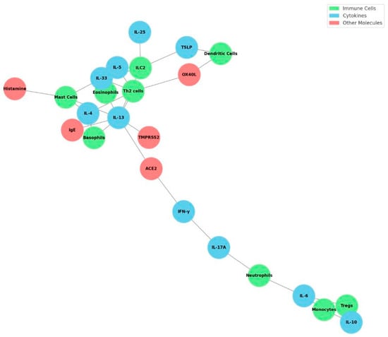 Network of Cells, Cytokines, and Molecules in COVID-19 Allergy Immunopathology. This network diagram visually summarizes the complex interactions between key immune cells, cytokines, and other molecules involved in the immunopathogenesis of allergy predisposition following SARS-CoV-2 infection. Immune cells (green nodes) such as type 2 innate lymphoid cells (ILC2), Th2 cells, eosinophils, mast cells, basophils, regulatory T cells (Tregs), monocytes, dendritic cells, and neutrophils are interconnected through cytokines (blue nodes), including IL-33, IL-25, thymic stromal lymphopoietin (TSLP), IL-4, IL-5, IL-13, IL-10, IFN-γ, IL-17A, and IL-6. Other critical molecules (red nodes) such as IgE, ACE2, TMPRSS2, OX40L, and histamine further bridge these interactions, reflecting molecular mechanisms that drive type 2 immune skewing and allergic sensitization after SARS-CoV-2 infection. This figure highlights potential therapeutic targets and underscores the interconnected nature of antiviral responses, epithelial barrier dysfunction, innate immune activation, and allergic pathways.