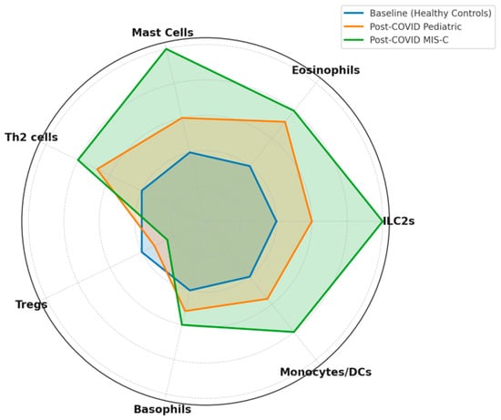 Cellular Changes Post-SARS-CoV-2 Linked to Allergy Risk. This radar chart illustrates the relative changes in key immune-cell populations associated with allergic predisposition following SARS-CoV-2 infection in children. It compares baseline immune cell levels (healthy controls), general pediatric patients post-COVID-19, and pediatric patients with multisystem inflammatory syndrome (MIS-C). Notably, post-COVID pediatric populations exhibit increased populations of innate lymphoid cells type 2 (ILC2s), eosinophils, mast cells, Th2 cells, basophils, and monocytes/dendritic cells (DCs), alongside a decrease in regulatory T cells (Tregs). These cellular shifts are markedly more pronounced in MIS-C patients, underscoring the potential impact of severe COVID-19-associated inflammation on long-term immune alterations favoring allergic responses. This visualization highlights critical immune-cell dynamics that could contribute to an increased risk of developing allergic diseases after SARS-CoV-2 infection. Charts were generated in Python 3.12 (matplotlib) and exported at 600 dpi (PNG). Schematic/qualitative visualizations (not a meta-analysis), using relative scales (0–5) informed by the directionality and magnitude reported across cited studies; they are intended to communicate comparative patterns across disease states (mild pediatric COVID-19, MIS-C, recovery), not pooled effect sizes.