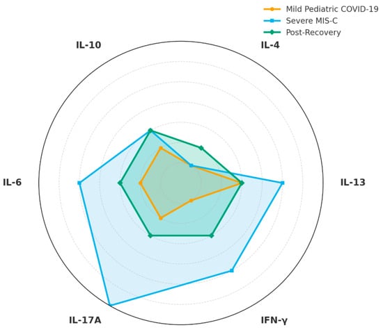 Th1/Th2/Th17/Treg Cytokine Dynamics during and after SARS-CoV-2 Infection. This radar chart summarizes relative cytokine levels representative of Th1 (IFN-γ), Th2 (IL-4, IL-13), Th17 (IL-17A), and regulatory T cell-associated cytokines (IL-10), alongside IL-6, during three different phases of pediatric SARS-CoV-2 infection. Mild pediatric COVID-19 infection shows moderate Th2 cytokine elevation and relatively balanced immune responses. Severe multisystem inflammatory syndrome in children (MIS-C) is distinguished by prominent elevations in IL-17A, IL-13, IFN-γ, IL-6, and IL-10, reflecting a robust hyperinflammatory state. During the post-recovery phase, cytokine profiles suggest persistent mild-to-moderate inflammation with sustained Th2 skewing (IL-13 elevation) and mild IL-17A expression. This figure highlights how cytokine dynamics differ substantially across clinical severity and recovery states, offering insights into potential immunological mechanisms underlying post-infectious allergy predisposition in pediatric patients following COVID-19. Charts were generated in Python 3.12 (matplotlib) and exported at 600 dpi (PNG). Schematic/qualitative visualizations (not a meta-analysis), using relative scales (0–5) informed by the directionality and magnitude reported across cited studies; they are intended to communicate comparative patterns across disease states (mild pediatric COVID-19, MIS-C, recovery), not pooled effect sizes.