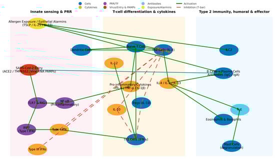 Network model of innate sensing, T-cell polarization, and effector responses at the interface of viral infection and allergen exposure. Nodes are grouped into three modules (light shading): Innate sensing and PRR (left), T-cell differentiation and cytokines (center), and Type-2 immunity, humoral and effector (right). Node colors denote category: cells (blue), cytokines (orange), PRR/transcription factors (purple), virus/entry and PAMPs (red), antibodies (sky blue), and exposure/alarmins (yellow). Edges encode regulation: solid green arrows = activation; dashed red arrows with T-bar heads = inhibition. Allergen exposure induces epithelial alarmins (TSLP/IL-25/IL-33) that activate ILC2 and promote Th2 cells and IL-4/IL-5/IL-13, culminating in B-cell class switching (IgE) and eosinophil/mast-cell effector functions; IL-4/IL-5/IL-13 also enhance plasma-cell responses. Viral RNA sensed via TLR7/RIG-I activates NF-κB (→ IL-6/TNF-α/IL-1β) and IRF7 (→ type I IFN), with type I IFN and IL-12 favoring Th1 polarization. Type III IFN and IL-10 dampen Th2 and inflammatory outputs; Tregs inhibit both Th1 and Th2. IgG/IgA neutralizing antibodies reduce SARS-CoV-2 entry (ACE2/TMPRSS2). Arrow direction reflects net influence and does not imply direct physical interaction. Abbreviations: PRR, pattern-recognition receptor; PAMPs, pathogen-associated molecular patterns; IFN, interferon; NF-κB, nuclear factor κB; IRF7, interferon regulatory factor 7; ILC2, group-2 innate lymphoid cell; TSLP, thymic stromal lymphopoietin; ACE2, angiotensin-converting enzyme 2; TMPRSS2, transmembrane protease serine 2; Ig, immunoglobulin; TNF-α, tumor necrosis factor-α.