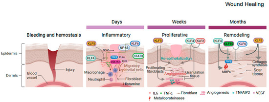Both KLF4 and KLF5 contribute to re-epithelialization, the process of forming a new epithelial layer over the wound bed, by stimulating epithelial cell migration, proliferation, and differentiation [65]. Interestingly, proliferative epithelial cells exhibit higher levels of KLF5, whereas differentiating cells predominantly express KLF4 [66]. The remodeling phase, the longest phase of wound healing, can last for months, strengthening and reorganizing the newly formed tissue [67]. KLFs are integral to scar formation, as they regulate the expression of genes involved in extracellular matrix (ECM) synthesis and remodeling, including collagen, fibronectin, and matrix metalloproteinases (MMPs) [68]. For example, KLF4 modulates the expression of MMPs, enzymes critical for ECM degradation [69]. KLF10 has been shown to modulate TGF-β signaling and influence fibroblast function and extracellular matrix production, suggesting involvement in wound healing [70]. Notably, KLF10 and KLF6 act as negative regulators of scar formation by inhibiting fibroblast proliferation and collagen synthesis [28]. Restoring the activity of these factors could help reduce excessive scar formation