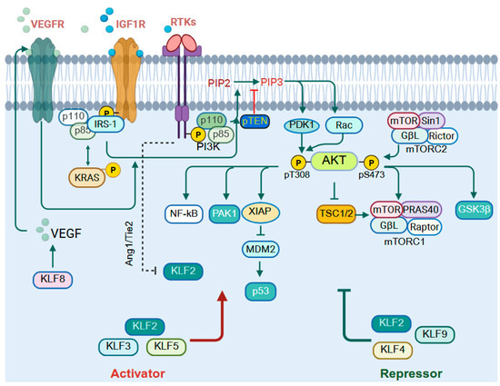 The PI3K/AKT pathway controls many aspects of cell function, such as growth, survival, and metabolism, responding to signals like growth factors, hormones, and nutrients [206]. Broadly, KLFs can function as either activators (KLF1, KLF5, KLF6, KLF8, KLF9, KLF14, and KLF15) or repressors (KLF2, KLF3, KLF4, KLF10, and KLF11) of PI3K/AKT signaling, though some exhibit context-dependent roles (Figure 4). KLF2 demonstrates a dual regulatory role in PI3K/AKT signaling whereby in colorectal cancer, ectopic overexpression of KLF2 reduces tumorigenicity by inducing ferroptosis through downregulation of GPX4, thereby suppressing PI3K/AKT activity [207], while in pancreatic β-cell injury caused by uric acid, resveratrol upregulates KLF2, which in turn modulates miR-126 to activate PI3K/AKT signaling [208]. KLF3 enhances PI3K/AKT signaling; in hepatocytes, miR-21-5p regulates lipogenesis and oxidative stress by targeting KLF3, which in turn activates the PI3K/AKT pathway [209]. In contrast, KLF4 inhibits this pathway by upregulating miR-206, which directly targets AKT2 in gastric cancer [210]. KLF5 and AKT exhibit reciprocal crosstalk that profoundly influences GI tumorigenesis. In hepatocellular carcinoma, KLF5 promotes tumor growth and metastasis through activation of the PI3K/AKT/Snail axis [211], and in colorectal cancer, KLF5 activates PI3K/AKT signaling to reprogram fatty acid metabolism and reduces immune cell infiltration, ultimately fostering therapy resistance [212].