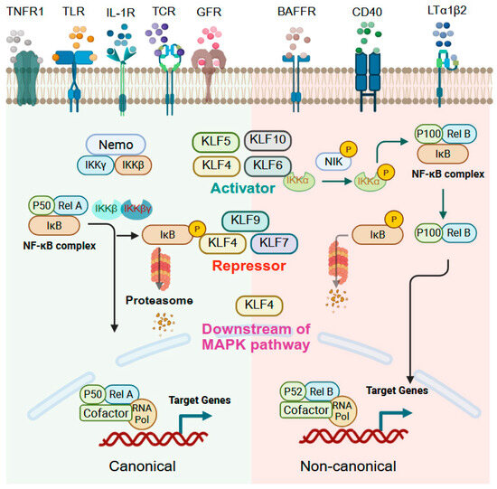 Nuclear factor kappa-B (NF-κB) comprises a family of transcription factors, including includes p50/p105/NF-κB1, p52/p100/NF-κB2, Rel/c-Rel, p65/RelA, and RelB, that orchestrate inflammation, immunity, cell survival, and apoptosis by responding to a wide range of stimuli such as pro-inflammatory cytokines, pathogens, oxidative stress, and environmental stressors [214,215,216]. The role of KLFs in NF-κB signaling is highly context-dependent, functioning either as activators or repressors depending on cell type, stimulus, and disease state (Figure 5). KLF4, for example, shows bidirectional regulation of NF-κB. In ESCC and eosinophilic esophagitis (EoE), KLF4 promotes NF-κB activation through upregulation of RhoF, a GTP-binding protein that stimulates NF-κB signaling [76]. Conversely, in non-alcoholic fatty liver disease, extracellular vesicles enriched in microRNA-1 suppress KLF4 in endothelial cells, thereby enhancing NF-κB activation and vascular inflammation [217]. In hepatocytes, Kallistatin induces KLF4, which in turn activates NF-κB by downregulating CGI-58, preventing sequestration of the p65 subunit [218]. Similarly, DSS-induced colitis is attenuated in Klf4-deficient mice, demonstrating the necessity of KLF4 for NF-κB pathway activation in intestinal inflammation [55]. Interestingly, KLF4 itself can also be downstream of NF-κB; in gastric intestinal metaplasia, KLF4 is induced via NF-κB signaling activated by hTERT [219]. However, in hepatocellular carcinoma (HCC), KLF4 is ubiquitinated and degraded by TRAF7, a TNFα/NF-κB pathway E3 ubiquitin ligase, leading to tumor-promoting effects [220]. Both KLF5 and KLF6 can activate NF-kB signaling in the intestine. LPS exposure to intestinal epithelial cells induces inflammation through KLF5-mediated transcriptional upregulation of p50 and p65 [221]. KLF6, which is highly expressed in myeloid cells and inflamed intestinal tissue from IBD patients, regulates macrophage responses by promoting NF-κB activation while suppressing STAT3 signaling. Loss of KLF6 in mouse intestine confers resistance to colitis, underscoring its role in intestinal inflammation [31]. In contrast, KLF9 and KLF10 function as suppressors of NF-κB. Arsenic-induced hepatic toxicity downregulates KLF9, which normally serves as a positive regulator of PPARγ, a transcription factor that inhibits NF-κB directly or indirectly by stabilizing the NF-κB inhibitor IκB [222]. KLF10; meanwhile, restrains NF-κB activity in pancreatic cancer by maintaining SIRT6 expression, which suppresses p65 phosphorylation [223]. In summary, NF-κB and KLFs represent critical, interconnected transcriptional regulators of inflammation and disease progression.