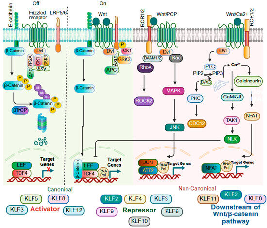 Wingless/integrated protein (Wnt) signaling is essential for embryonic development, including body axis formation, and adult tissue homeostasis and regeneration, including cell fate determination, cell migration and polarity, and stem cell maintenance, and dysregulation of Wnt signaling is strongly associated with human diseases, particularly cancer [224,225]. The Wnt family comprises secreted glycoproteins that bind to cell surface receptors and activate downstream signaling through two major pathways: canonical Wnt/β-catenin signaling and non-canonical pathways, the latter of which operate independently of β-catenin and frequently rely on calcium signaling or cytoskeletal regulation [226,227,228]. KLFs are pivotal regulators of Wnt signaling, acting as either activators or repressors depending on tissue or cellular context, and their influence extends beyond direct modulation of canonical or non-canonical cascades to also regulate expression of Wnt ligands, receptors, and antagonists (Figure 6). In gastric cancer KLF1 and KLF3 activate canonical Wnt/β-catenin signaling to promote EMT, but in colorectal cancer, reduced KLF3 expression promotes Wnt1 accumulation and activation of β-catenin signaling [113,114,229]. KLF2 also demonstrates dual functionality. In pluripotent stem cells, KLF2 functions downstream of Wnt/β-catenin signaling and cooperates with Tfcp2l1 to establish and maintain naïve pluripotency [230], while in colon cancer, simvastatin induces KLF2 expression in a mutant p53-dependent manner, leading to upregulation of p21WAF1/CIP1 and suppression of Wnt activity [231]. KLF4 and KLF5 illustrate another example of opposing functions. KLF4 serves as a negative regulator of canonical WNT signaling by directly binding β-catenin and blocking β-catenin acetylation by p300/CBP, thereby preventing nuclear translocation and transcriptional activity of β-catenin [232,233]. KLF4 is also negatively regulated by miR-92a, which promotes tumorigenesis through activation of Wnt/β-catenin signaling in colorectal cancer [234]. In contrast, KLF5 enhances Wnt activity by interacting with β-catenin and TCF4 to activate Wnt target genes [134,235], and in esophageal squamous epithelial cells, pharmacological inhibition of KLF5 with ML264 promotes β-catenin degradation [78]. Consistent with a WNT-promoting function for KLF5, ablation of Klf5 in Lgr5+ intestinal stem cells of mice reduces expression of WNT target genes [25]. In colorectal cancer, KLF6-positive cells display reduced Wnt activity and diminished stemness, favoring a wound-healing phenotype [236], but in fluorouracil–resistant colorectal cancer cells, KLF6 promotes nuclear β-catenin localization, again highlighting potential context-dependent functions of the KLFs [237]. KLF8 also exhibits dual regulatory capacity, as Wnt3a stimulation induces KLF8 expression, indicating its role as a downstream effector of Wnt/β-catenin signaling, while KLF8 overexpression in HCC cells increases both cytoplasmic and nuclear β-catenin, suggesting an upstream function, and high KLF8 expression together with nuclear β-catenin correlates with aggressive HCC and is associated with enhanced stem-like traits [238,239]. In PDAC, KLF9 suppresses Wnt/β-catenin signaling by downregulating Frizzled-5 [240]. β-catenin acts as a coactivator of KLF11 in gastric cancer, promoting the expression of stemness-related genes [241], and KLF12 activates Wnt/β-catenin signaling by elevating DVL2, thereby enhancing the proliferative and invasive potential of PDAC cells [242]. Together, these findings illustrate the intricate and context-specific roles of KLF family members in modulating Wnt signaling, thereby influencing cell fate, stemness, tumor progression, and therapeutic response.