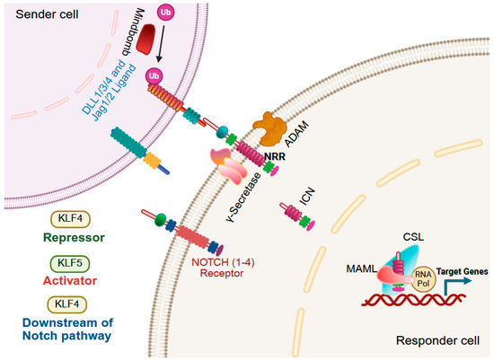 The Notch signaling pathway is a highly conserved, contact-dependent pathway that governs cellular differentiation, proliferation, survival, and stem cell maintenance. In mammals, four Notch receptors interact with five canonical ligands, Delta-like (DLL1, DLL3, DLL4) and Jagged (JAG1, JAG2) [243,244]. Ligand binding induces sequential proteolytic cleavages, first by ADAM metalloproteases, followed by γ-secretase-mediated release of the intracellular Notch domain (ICN), which is then translocated to the nucleus to activate Notch-responsive genes. Dysregulated Notch signaling is a hallmark of multiple cancers, where it may act as either a tumor suppressor or an oncogene depending on tissue context [245]. In the gastrointestinal tract, KLFs are important mediators of NOTCH signaling (Figure 7). For example, Notch1-mediated ICN represses KLF4 via the transcriptional repressor HES1, thereby inhibiting goblet cell differentiation, although KLF4 loss or Notch pathway ablation in intestinal stem cells does not impede the differentiation of progenitors into goblet cells in adult mice [140,246,247]. In esophageal epithelial cells, Notch1 inhibition activates KLF4, driving transdifferentiation toward columnar-like cells that express keratins indicative of a Barrett’s esophagus lineage and glandular mucins, while reducing squamous keratin expression [248]. In colon tumor organoid cultures, Notch inhibition favors goblet cell marker expression, while BMP activation promotes enterocyte lineage differentiation [249]. Klf5 deletion in Lgr5+ intestinal stem cells reduces NOTCH signaling, and these Klf5-null intestinal stem cells fail to produce any secretory lineages [25].