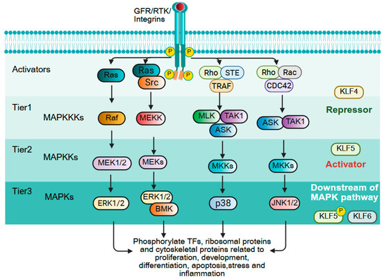 The mitogen-activated protein kinase (MAPK) pathway consists of a sequential activation of serine/threonine kinases that governs cell proliferation, differentiation, and survival [250]. The cascade is hierarchically organized into three tiers: (1) MAPK kinase kinases, (2) MAPK kinases, and (3) terminal MAPKs that phosphorylate transcription factors, ribosomal proteins, and cytoskeletal components to drive context-dependent responses. In cancer, MAPK signaling is frequently hyperactivated due to mutations (e.g., KRAS, BRAF) or overexpression of upstream regulators, promoting tumor growth and drug resistance [251]. KLFs both regulate and are regulated by MAPK signaling, creating feedback loops that influence cell fate (Figure 8). KLF4 predominantly functions as a negative regulator of MAPK pathway activation, and ERK-mediated induction of E2F1 promotes KLF4 transcription, leading to elevated KLF4 that suppresses phosphorylation of JNK, ERK, and p38, thereby attenuating MAPK signaling and reducing tumor cell proliferation [252,253]. However, ERK activation can also trigger KLF4 degradation via ubiquitination, indicating a finely tuned regulatory balance [254]. In contrast, KLF5 exerts a context-dependent influence on MAPK signaling, often acting as an amplifier. KLF5 transcriptionally upregulates pyruvate dehydrogenase PDP1, which serves as a scaffold to enhance BRAF–MEK1 interaction, thereby activating MAPK signaling and also induces EGFR expression, further promoting MEK/ERK pathway activity in epithelial cells [251,255]. Downstream, activation of ERK1/2 and p38 drives cyclin D1 expression through KLF5, facilitating G1/S cell cycle progression [256]. MAPK signaling also regulates KLF5 expression in a tumor-specific manner: in CRC, prion protein (PrPC) colocalizes with EGFR to activate p38, which upregulates KLF5 and contributes to cisplatin resistance, while KRAS-mutated CRC cells exhibit high KLF5 expression via the KRAS–RAF–MEK–ERK axis [257]. Conversely, in KRAS-mutated pancreatic cancer, KLF5 induction is mediated by IL-1β and hypoxia through p38 MAPK signaling, independent of KRAS–ERK activation [258]. Beyond transcriptional regulation, MAPK signaling post-translationally modifies KLF5; for example, ERK phosphorylation at Ser-406 enhances KLF5 transcriptional activity and stability, whereas p38 phosphorylation at the same site diminishes its interaction with retinoic acid receptor (RAR)-α, altering target gene specificity [2,259]. MAPK also influences KLF6 activity, with RAS–MAPK signaling altering its splicing through the SR protein ASF/SF2, leading to inactivation and promoting HCC growth [260,261]. Collectively, the MAPK–KLF regulatory network forms a bidirectional axis in cancer biology, since MAPK activity can reciprocally modulate KLF function through transcriptional control and post-translational modifications. Deciphering these interactions may uncover therapeutic opportunities to jointly target oncogenic MAPK signaling and KLF-mediated transcriptional programs.