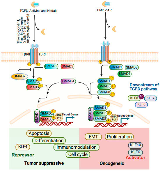 Transforming Growth Factor-beta (TGFβ) signaling orchestrates a wide spectrum of cellular processes, including proliferation, differentiation, apoptosis, immune modulation, and tissue homeostasis [262,263]. The TGF-β superfamily comprises three TGFβ isoforms, activins, Nodal, BMPs and several growth and differentiation factors [264,265,266]. These ligands are secreted as latent dimers bound to the extracellular matrix (ECM) and require precise activation mechanisms to be released in their bioactive form, and TGF-β signaling is mediated and regulated by the SMAD family of proteins. In cancer, TGFβ signaling typically displays a dual role: in early stages, it functions as a tumor suppressor by inducing cell cycle arrest and apoptosis, while in advanced stages, it promotes tumor progression by driving EMT, angiogenesis, cancer-associated fibroblast activation, and immune evasion [267]. KLFs are capable of influencing both its tumor-suppressive and tumor-promoting functions of TGFβ signaling (Figure 9). KLF4 and TGFβ exhibit reciprocal regulation, with each able to suppress the other’s activity. KLF4 is a transcriptional target of BMP-2/4/6 and TGFβ1 in vascular smooth muscle cells [268], promoting mesenchymal-to-epithelial transition (MET) by increasing E-cadherin and reducing vimentin and Slug levels thereby counteracting TGFβ-induced EMT [269,270]. Conversely, TGFβ acetylates KLF5 at lysine 369 to activates CXCR4 and drives paracrine IL-11 secretion via IL-6 signaling, which sustains EMT and contributes to drug resistance through BCL2 upregulation [271,272]. In CRC, mesenchymal stromal cell–derived CCL7 enhances KLF5/CXCL5 signaling to promote metastasis, whereas TGFβ suppresses this pathway via SMAD4 modulation [273]. KLF6 facilitates TGFβ-driven EMT by upregulating TGFβR1, yet platelet-derived TGFβ downregulates KLF6 to promote HCC progression [274,275]. KLF8, a transcriptional target of TGFβ, promotes EMT and tumor progression in CRC and gastric cancers [119,161]. Collectively, these findings underscore that TGFβ–KLF interactions form a finely tuned regulatory axis with major implications for cancer biology, fibrosis, and inflammation. The role of other KLF family members in TGFβ signaling within GI cancers remains largely unexplored, and more insights, leading to strategic targeting of this axis could enable therapeutic approaches that preserve the tumor-suppressive actions of TGFβ while minimizing its pro-metastatic effects.