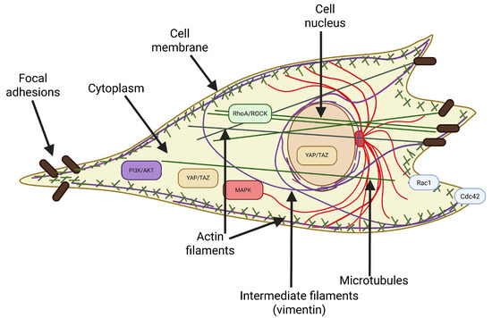 Cell deformability is one of the fundamental mechanical properties of living cells, reflecting their ability to change shape under the influence of mechanical force [36]. It is not a static or purely physical feature, but a dynamic parameter that integrates the properties of the cytoskeleton, cell membrane, nucleus, intracellular pressure, and interactions with the microenvironment [37]. Figure 1 shows a schematic representation of a cell, emphasizing the structural components and signaling pathways that affect its deformability.