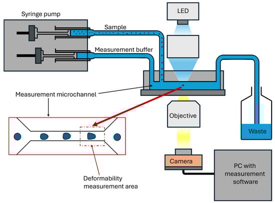 Real-time deformability cytometry (RT-DC)—instrument and measurement principle. Syringe pumps deliver the sample and measurement buffer, which hydrodynamically focuses cells in the measurement microchannel. In the designated deformability measurement area, cells are transiently deformed under laminar flow. LED illumination and the objective project the image onto a high-speed camera. The PC performs real-time segmentation and contour extraction and computes cell size and deformability.