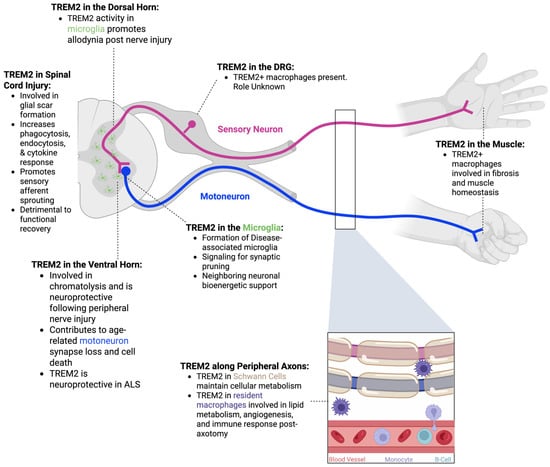 One potential target for cell-type-specific modification is Triggering Receptor Expressed on Myeloid Cells 2 (TREM2). TREM2 is found in both CNS and peripheral immune cells and is regarded as a “double-edged sword,” since knock-out rodent models have yielded beneficial or detrimental results depending on the disease model [10]. In this review, we provide a brief introduction to TREM2, followed by an examination of its potential implications in health, disease, and injury, utilizing the spinal cord and peripheral nervous system (PNS) anatomy as a roadmap for discussing TREM2 involvement in sensory and motor neuropathologies of the spinal cord specifically (summarized in Figure 1).