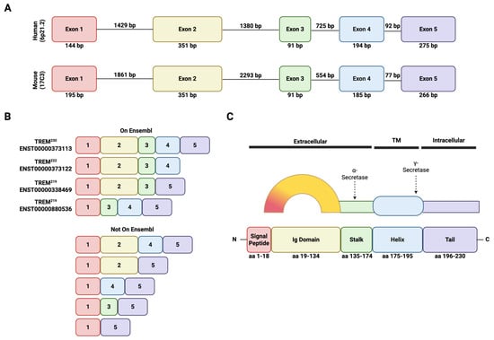 TREM2 gene structure, splice variants, and translation. (A) Gene structure of TREM2 in humans and mice. (B) Identified splice variants available on Ensembl or in publications [21]. (C) Human TREM2 protein domains. Abbreviations: bp (base pairs), aa (amino acids), and TM (transmembrane).