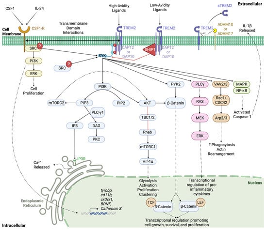 TREM2 Signaling Cascade. Abbreviations: Colony Stimulating Factor 1 (CSF1), Interleukin-34 (IL-34), Colony Stimulating Factor 1 Receptor (CSF1-R), Src Family Kinases (SRC), phosphatidylinositol 3-kinase (PI3K), extracellular signal-regulated kinase (ERK), Triggering Receptor Expressed on Myeloid Cells 2 (TREM2), DNAX activation protein of 12kDa (DAP12), DNAX activation protein of 10kDa (DAP10), Spleen Tyrosine Kinase (SYK), phosphatidylinositol-4,5-bisphosphate (PIP2), phosphatidylinositol-3,4,5-trisphosphate (PIP3), mammalian target of rapamycin complex 2 (mTORC2), phospholipase γ1 (PLC-γ1), diacylglycerol (DAG), inositol trisphosphate (IP3), protein kinase C (PKC), inositol trisphosphate receptor (IP3R), calcium (Ca2+), protein kinase B (AKT), Tuberous Sclerosis Complex-1 and -2 (TSC1/2), Ras homolog enriched in brain (Rheb), mammalian target of rapamycin complex 1 (mTORC1), hypoxia-inducible factor 1-alpha (Hif-1α), Proline-rich Tyrosine Kinase 2 (PYK2), T cell factor (TCF), lymphoid enhancer-binding factor (LEF), phospholipase γ (PLC-γ), mitogen-activated protein kinase kinase (MEK), Vav Guanine Nucleotide Exchange Factor 2 and 3 (VAV2/3), Ras-related C3 botulinum toxin substrate 1 (Rac1), cell division control protein 42 homolog (CDC42), actin-related protein 2/3 (Arp2/3), Mitogen-Activated Protein Kinase (MAPK), Nuclear Factor- ϰB (NF- ϰB), interleukin-1β (IL-1β), soluble TREM2 (sTREM2), A Disintegrin and Metalloprotease 10 (ADAM10), A Disintegrin and Metalloprotease 17 (ADAM17), and SH2-containing inositol 5’-phosphatase-1 (SHIP1).