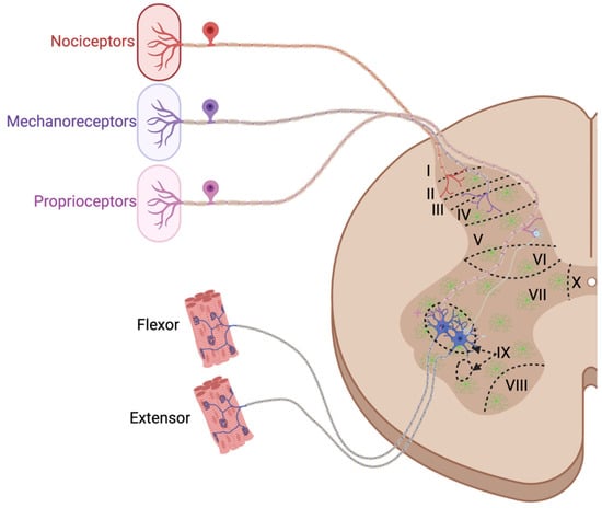 Simplified illustration of spinal reflex circuitry. The figure illustrates the different types of sensory neurons and where they terminate within a lumbar spinal cord segment. Nociceptors (red) terminate on interneurons (not shown) in lamina I-II, mechanoreceptors (purple) terminate on interneurons (not shown) in lamina III-IV, and proprioceptors (pink) terminate on interneurons in lamina V (light blue) and motoneurons in lamina IX (dark blue). Microglia (green), the spinal cord’s resident immune cell, are predominantly responsible for synapse and neuron removal in healthy development, aging, disease, and injury.